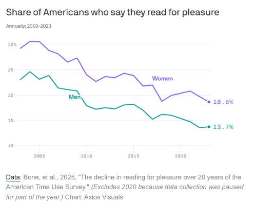 📕Don’t forget to touch grass and read a book: The share of Americans reading for pleasure has been falling for the past two decades