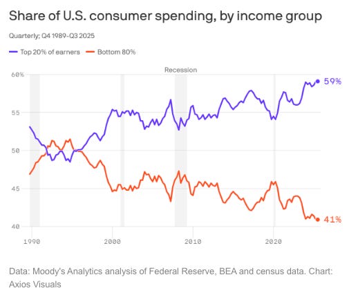 🤑The health of the economy increasingly depends on rich people spending money. Why it matters: That puts the U.S. in a fragile place because consumer spending drives growth — so the economy now relies on a smaller number of people to keep things afloat.