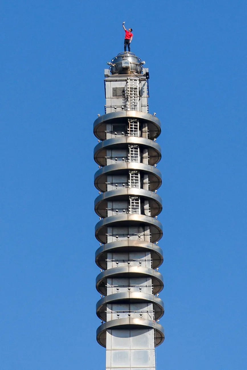 Alex Honnold, famous for “Free Solo,” takes a selfie atop Taipei 101 in Taiwan after free soloing the 11th-tallest skyscraper (1,667 feet) in the world.